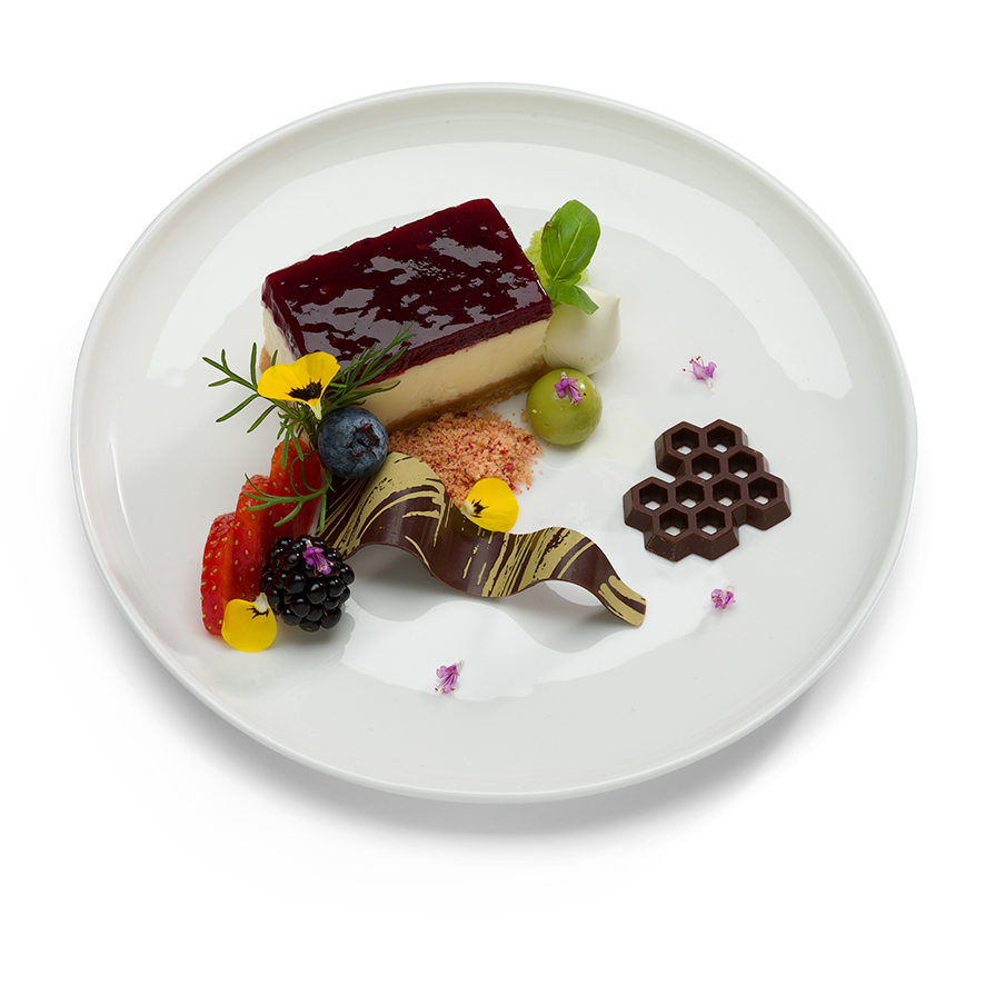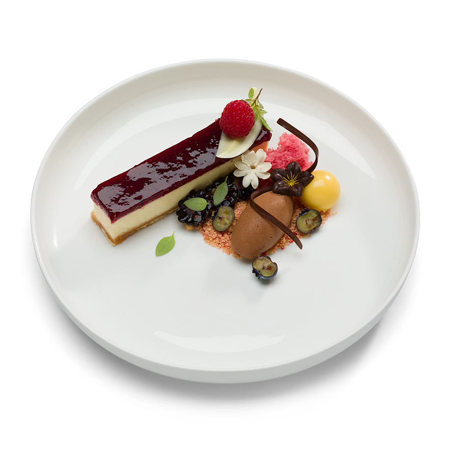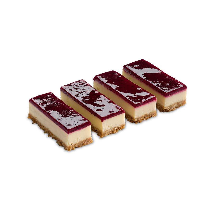 Une base de biscuits sablés au beurre avec un remplissage crémeux de fromage à la crème danois, fini avec un miroir brillant de gelée de cassis et de groseilles.